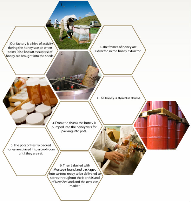 At Mossop’s we own and operate our own beehives and therefore oversee all aspects of honey making including producing the honey, extracting, storing, packing into jars labelling, marketing and distributing the final product in New Zealand and overseas.