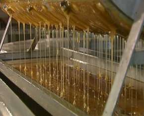 At the factory the supers of honey are extracted. To do this, the wax cappings are sliced off each frame to be melted down later into blocks of beeswax.