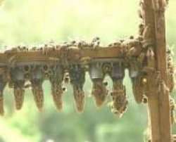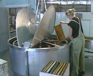 The uncapped frames are put into the honey pricker to aid the removal of honey, then into the extractor which spins the frames, throwing out the honey.